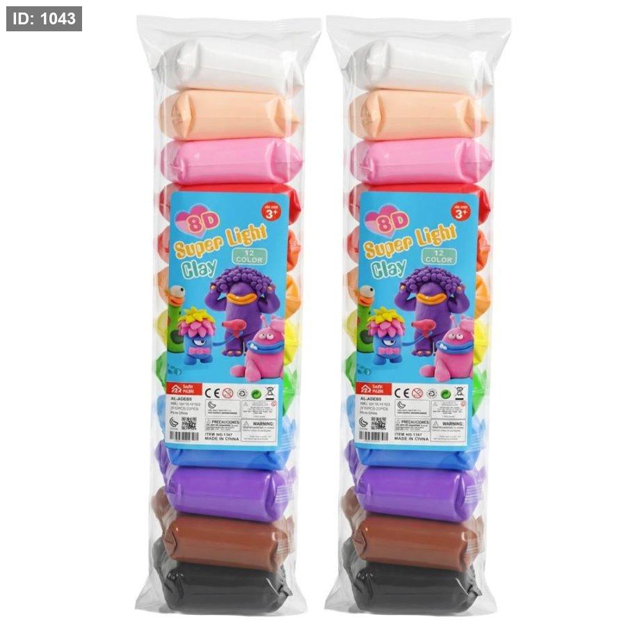 المنتج المعروض في الصورة هو صلصال أطفال خفيف "8D Super Light Clay" مكون من عبوتين، كل عبوة تحتوي على 12 لونًا.