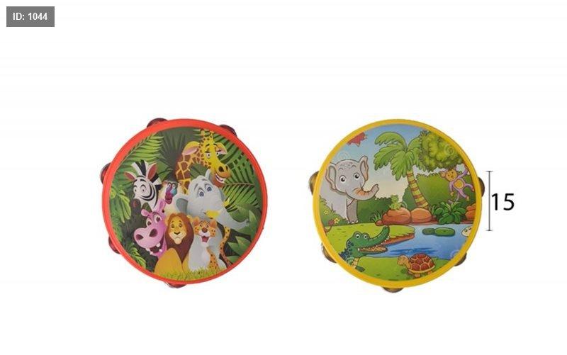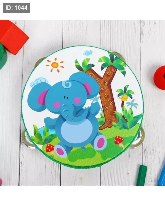 هذا طبل صغير (دف) لعبة للأطفال مرسوم عليه رسوم حيوانات.