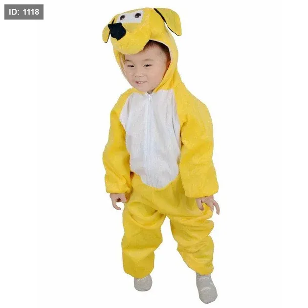 زي كلب للأطفال باللون الأصفر، مصمم للأعمار من 4 إلى 5 سنوات، بطول 100 سم تقريبًا.