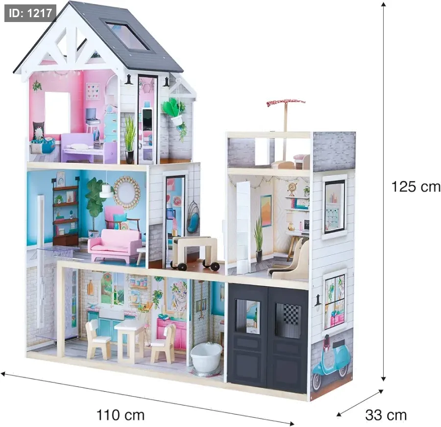 الميزات: يضم 3 طوابق متصلة بسلمين، و5 غرف، وشرفة واسعة توفر مساحة للعب التخيلي. كما يحتوي على جرس باب حقيقي يعمل، وباب منزلق، ونوافذ يمكن فتحها، وخزائن بجوار السرير بأدراج.