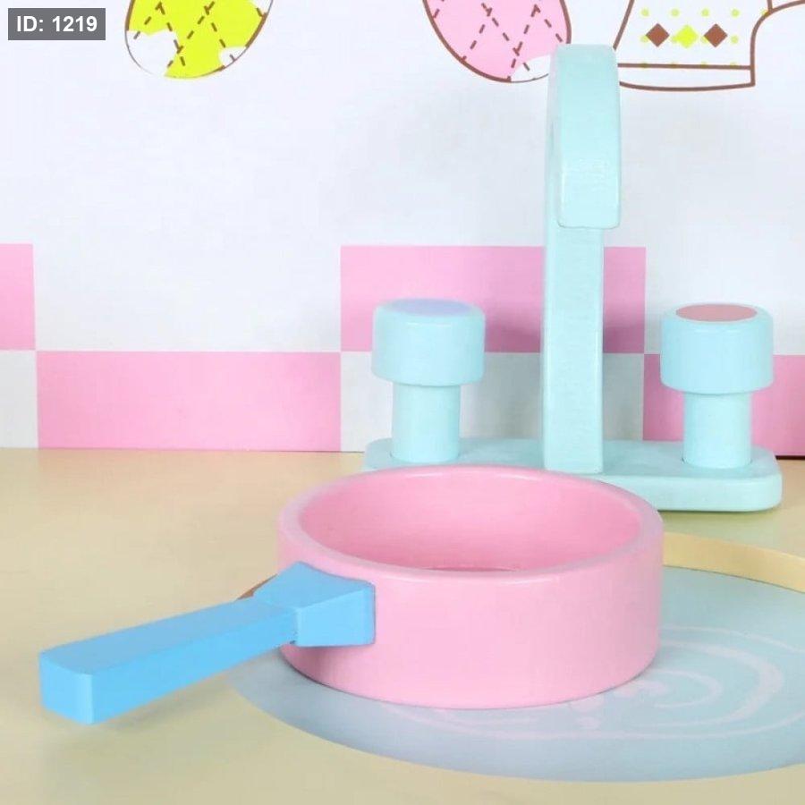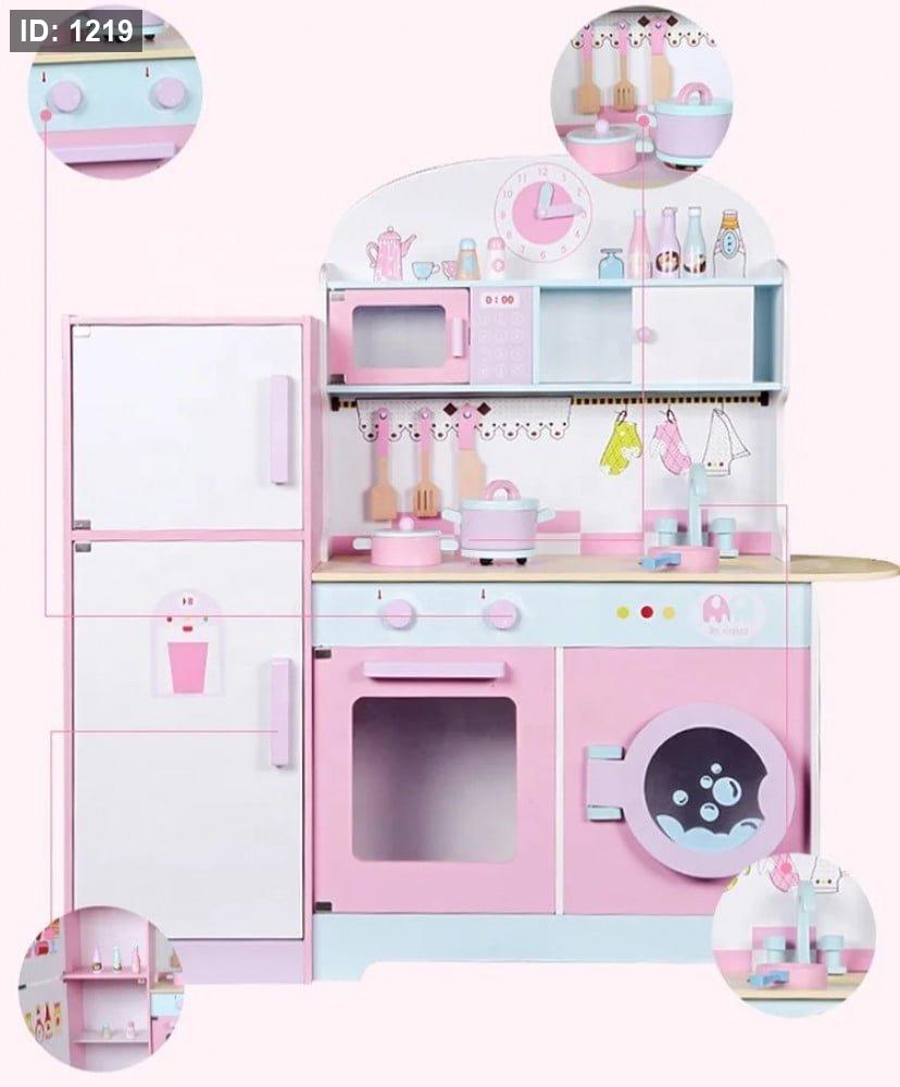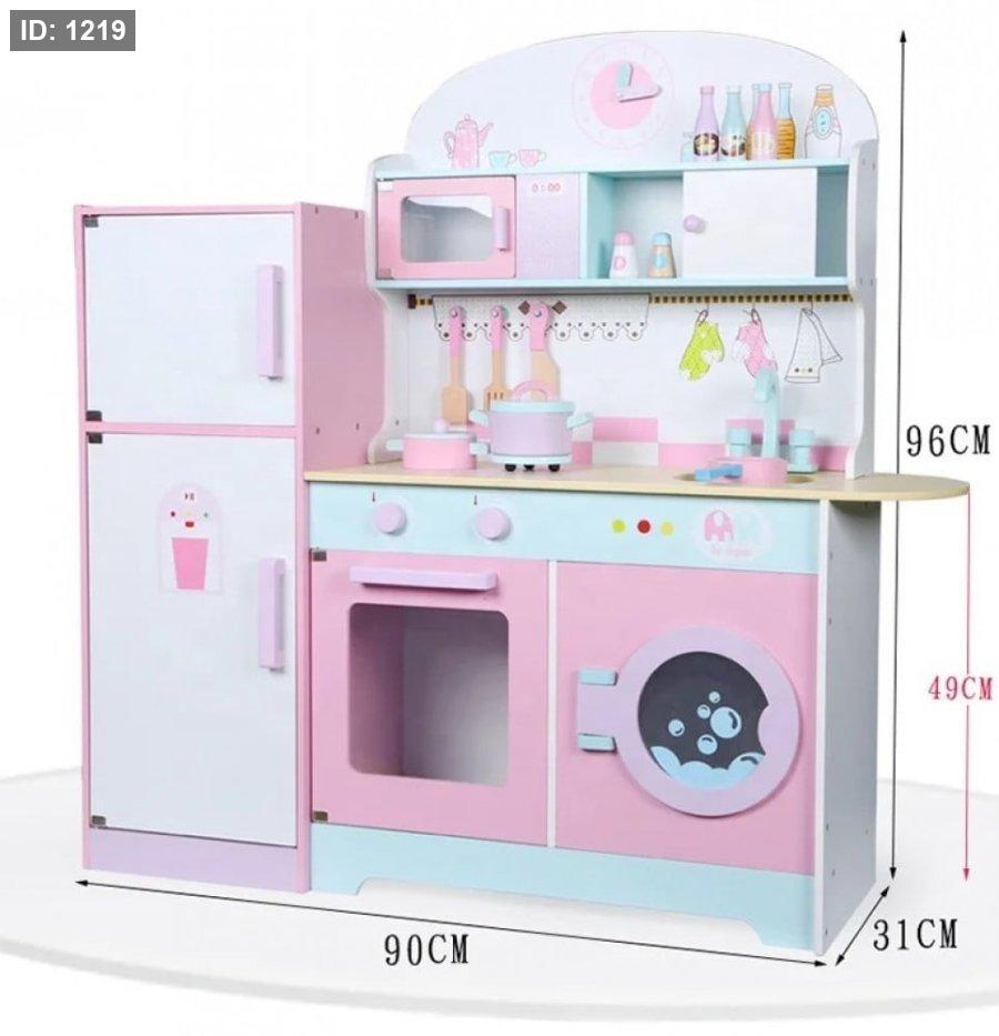 لعبة المطبخ الخشبية المعروضة في الصورة هي مجموعة لعب أدوار شائعة للأطفال تتميز بتصميم مدمج يجمع بين المطبخ والثلاجة والغسالة في هيكل واحد. هذه المجموعات متوفرة على نطاق واسع من قبل بائعين ومصنعين مختلفين، وتأتي عادةً بألوان الباستيل مثل الوردي والأزرق الفاتح والأبيض كما هو موضح.