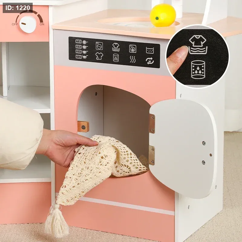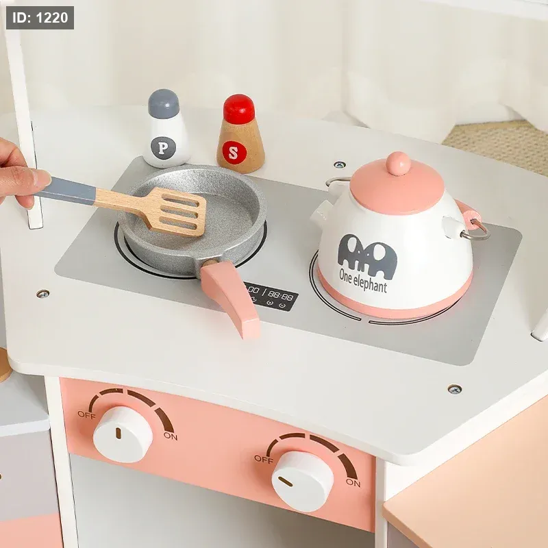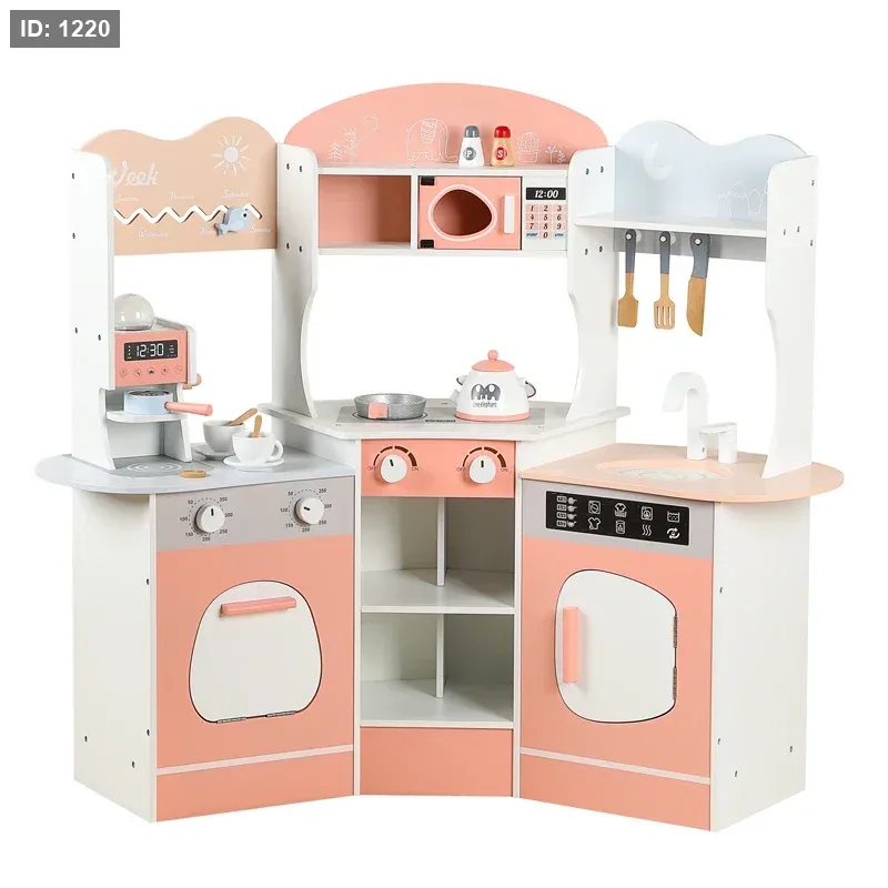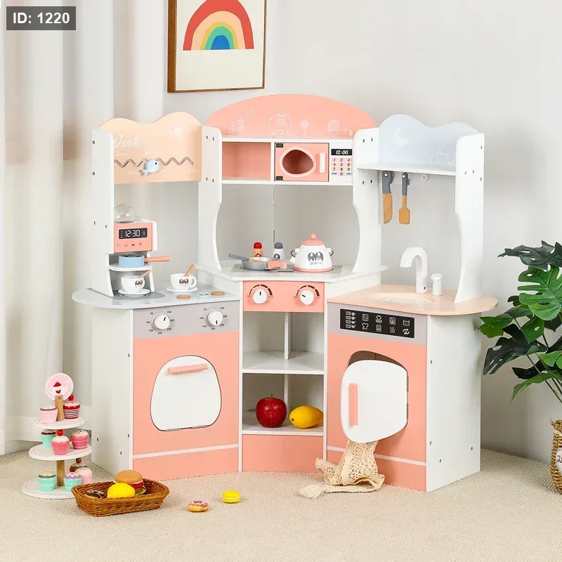 مجموعة مطبخ ألعاب خشبية بتصميم زاوية.