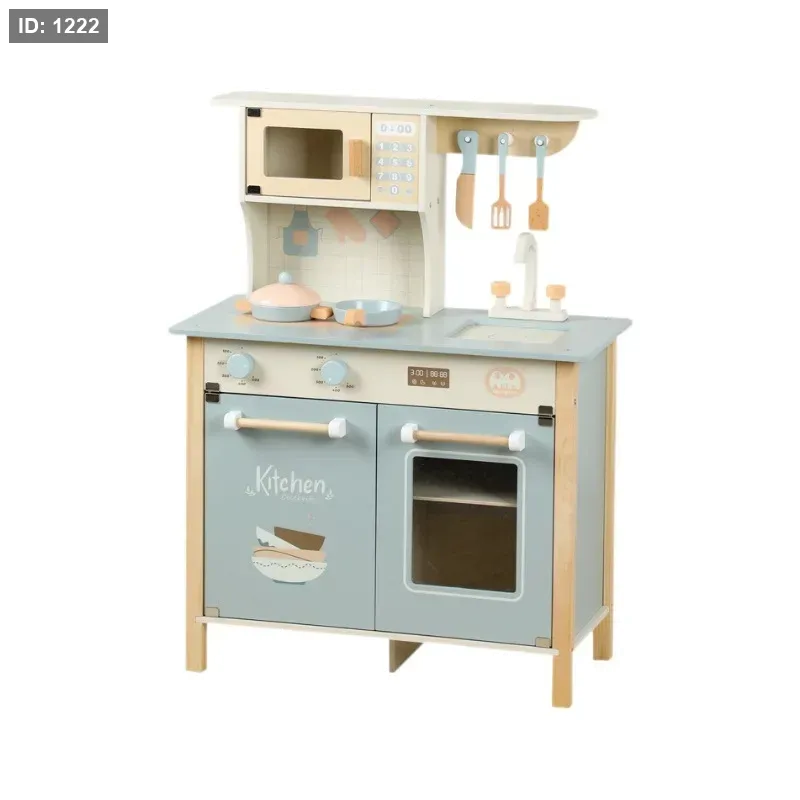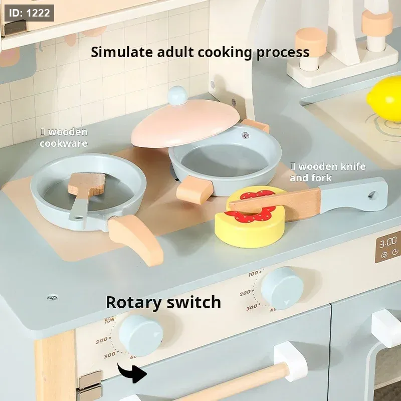 مجموعة مطبخ لعب خشبية للأطفال الصغار مع إكسسوارات للطهي.