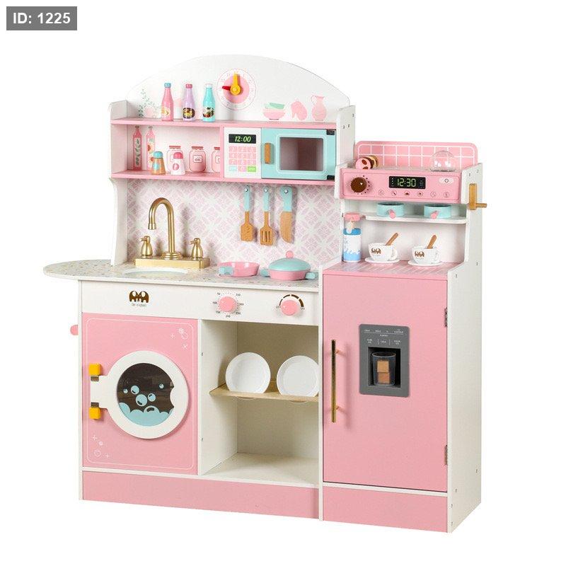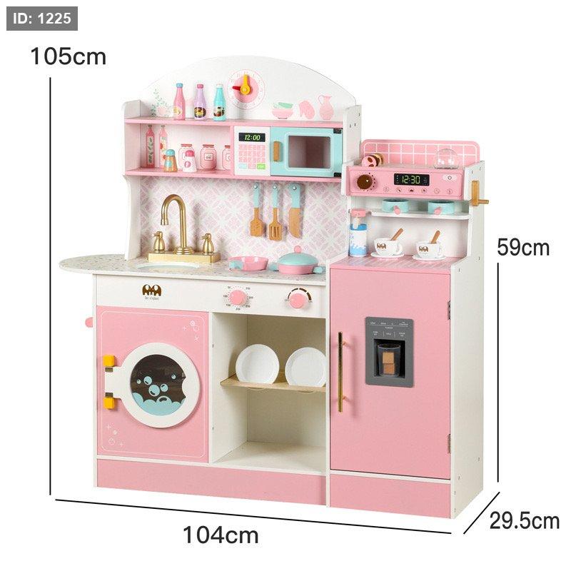 المكونات: تتضمن المجموعة حوض غسيل مع صنبور ذهبي، وموقدًا بأزرار دوارة، وفرن ميكروويف وردي فاتح، وثلاجة وردية بباب يعمل كموزع للمياه الوهمية.