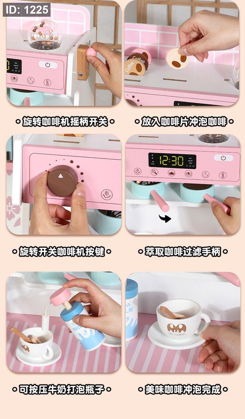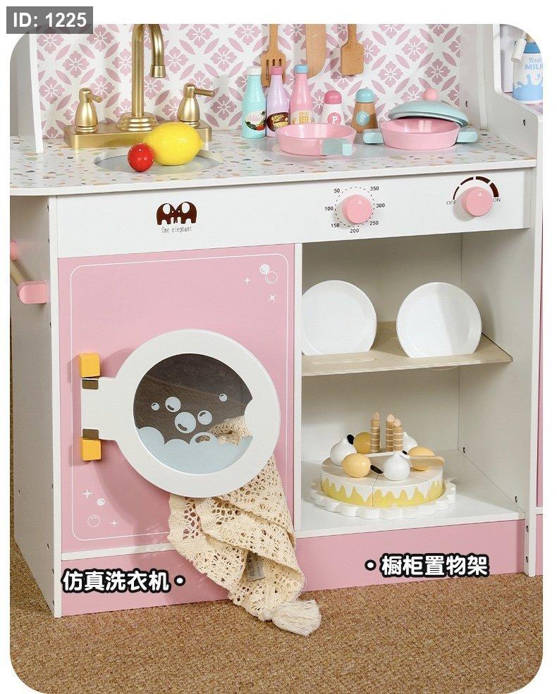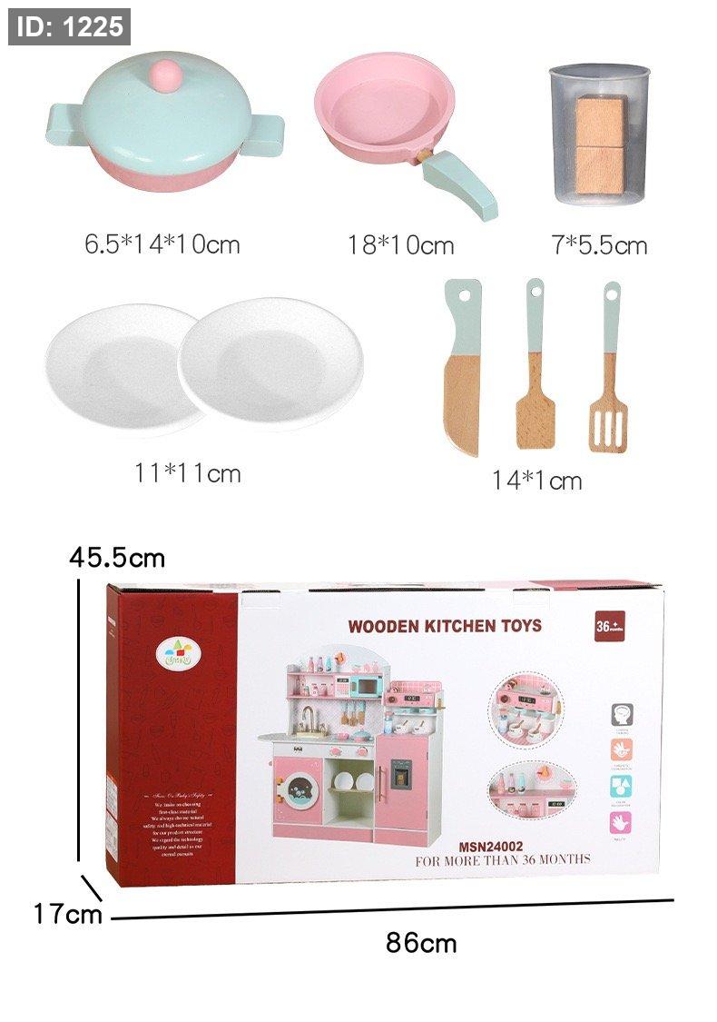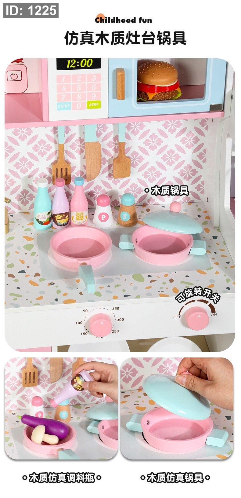 مجموعة مطبخ لعب خشبية للأطفال باللونين الوردي والأبيض.