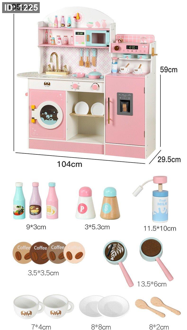 التفاصيل: توجد أرفف علوية وسفلية للتخزين، وساعة لعب في الأعلى، وتفاصيل صغيرة مثل الأكواب وأوعية التوابل على الأرفف.