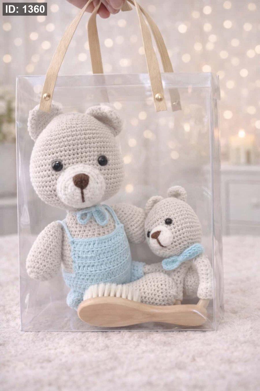 طقم لطيف مصنوع يدويًا بالكروشيه، تصميم ناعم وآمن للأطفال، يأتي داخل حقيبة شفافة أنيقة ومناسب كهدية مميزة.