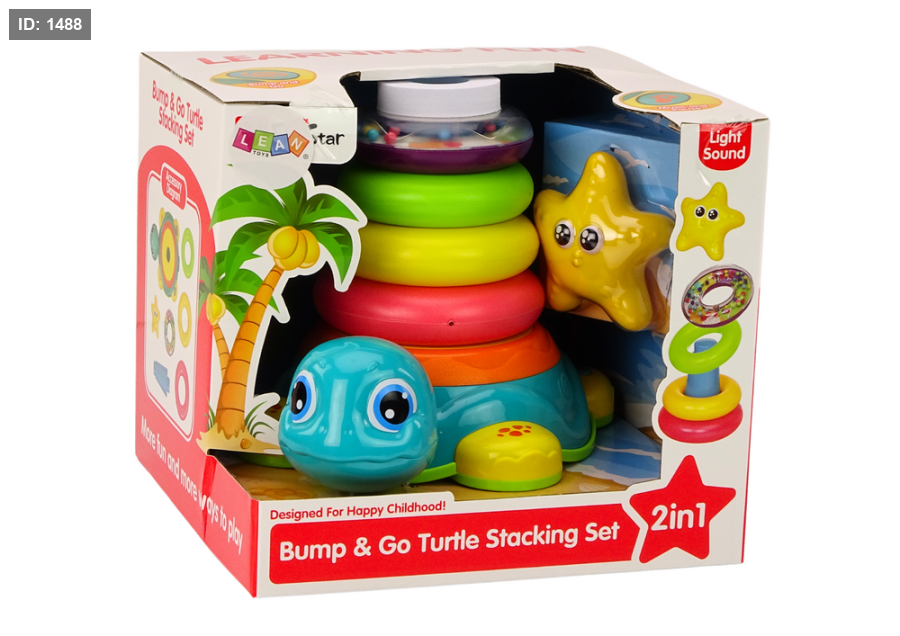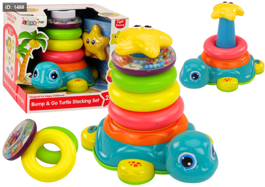 تتضمن اللعبة 4 حلقات ملونة وقطعة علوية على شكل نجمة يمكن تكديسها على ظهر السلحفاة.