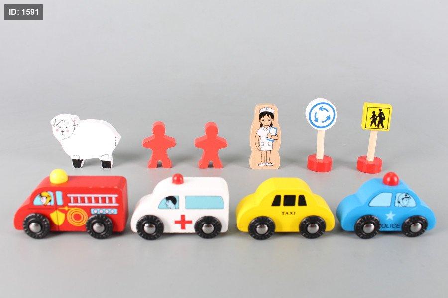 4 مركبات: سيارة أجرة صفراء، سيارة إسعاف بيضاء، سيارة شرطة زرقاء، وشاحنة إطفاء حمراء.