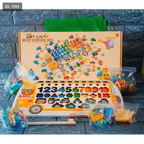 هذه لعبة ألغاز خشبية تعليمية على شكل حافلة مدرسية مشغولة ومتعددة الأنشطة.