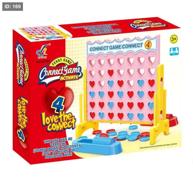 محتويات العلبة: تتضمن عادةً شبكة اللعب، وبعض الأرجل، وشريط تمرير لتحرير الأقراص، و21 قرصًا أحمر و21 قرصًا أصفر، بالإضافة إلى التعليمات.