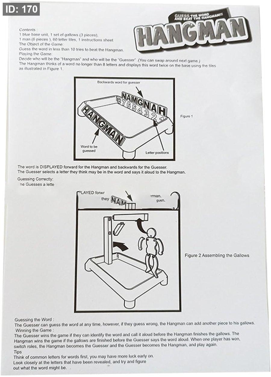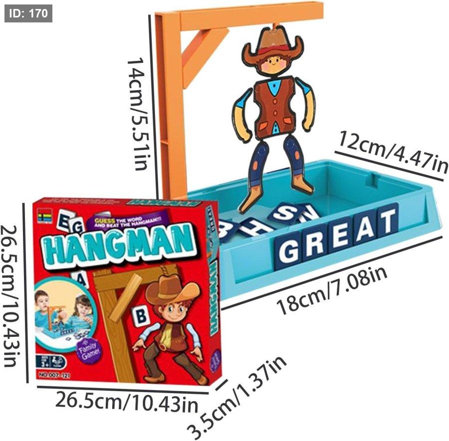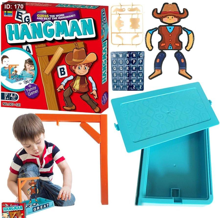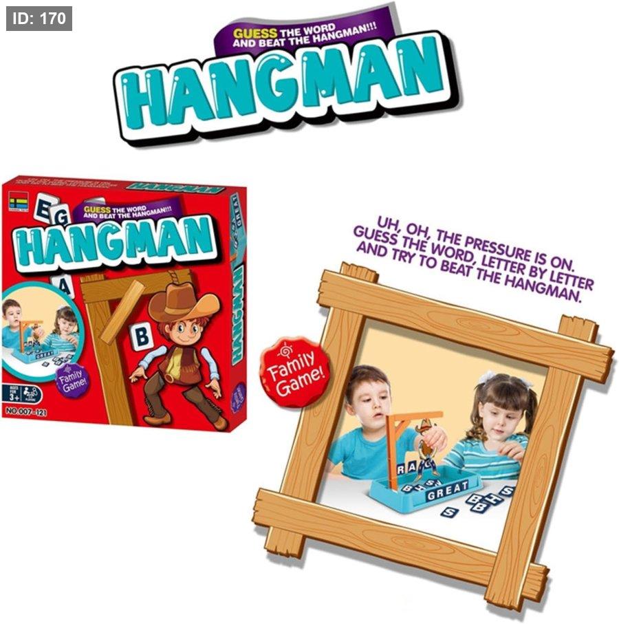 طريقة اللعب: يمكن أن يلعبها لاعبان أو أكثر. يفكر لاعب في كلمة سرية، ويمثل كل حرف فيها بشرطة. يتناوب اللاعبون الآخرون على تخمين الحروف. كل تخمين خاطئ يؤدي إلى إضافة جزء من "الرجل المعلق" على المشنقة. يفوز اللاعبون إذا خمنوا الكلمة قبل اكتمال الرسم.