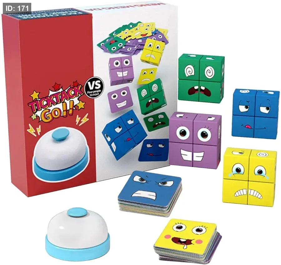 المكونات: تتضمن اللعبة عادةً مجموعة من المكعبات الملونة (16 مكعبًا في المجموع، كل لاعب لديه مجموعة من 4) مع وجوه تعبيرية مختلفة على كل جانب، ومجموعة من بطاقات التحدي التي تظهر تعبيرات محددة، وجرس.