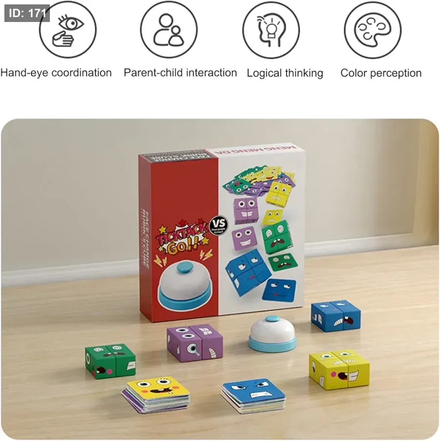 لعبة الألغاز المعروضة هي "Tick Tack Go!!" Face Changing Building Blocks، والمعروفة أيضًا باسم "Smiling Face War Money" أو ببساطة "Meng Meng Da". هذه لعبة تفاعلية سريعة الخطى تختبر ردود الأفعال والتركيز وسرعة البديهة.