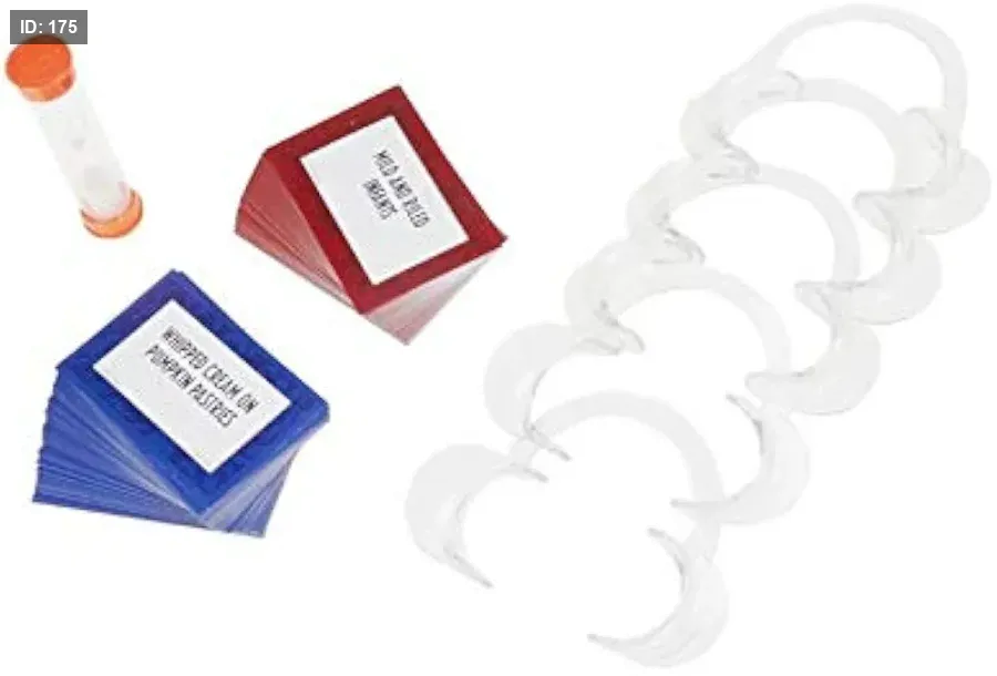 المحتويات: تتضمن المجموعة عادةً 5 قطع فموية (أدوات سحب الأسنان)، و200 بطاقة ذات وجهين، ومؤقت، وتعليمات.