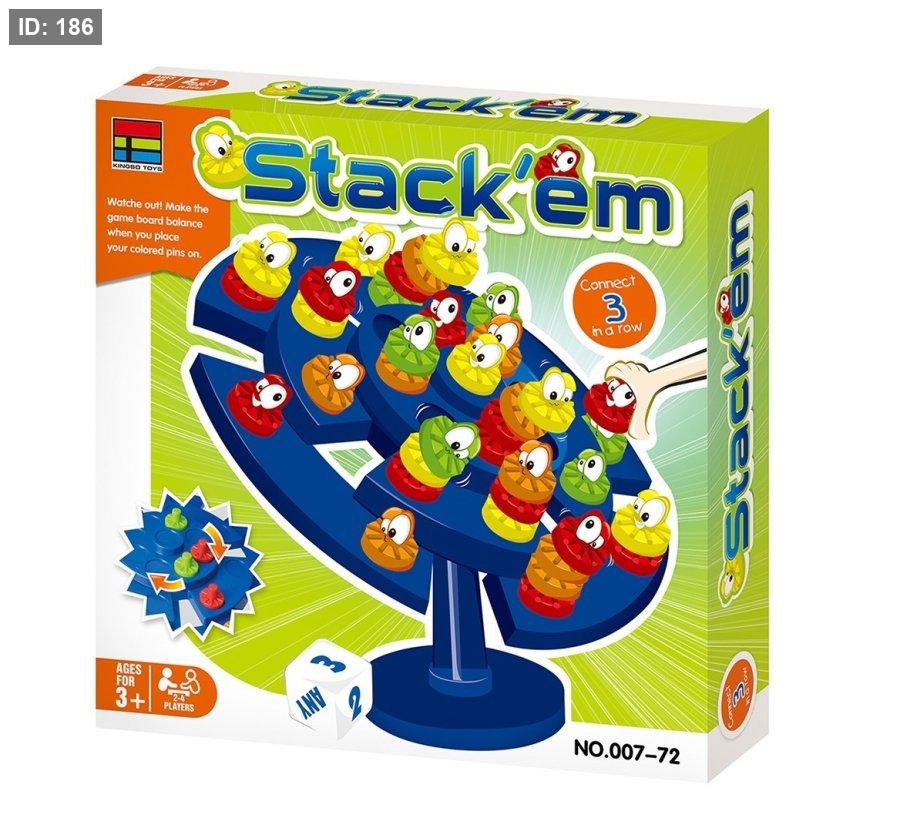 لعبة Stack'em Connect 3 هي لعبة توازن لوحية تتحدى اللاعبين لوضع الأوتاد الملونة على منصة غير مستقرة. الهدف هو أن تكون أول من يحصل على ثلاثة قطع متتالية دون أن يسقط البرج.