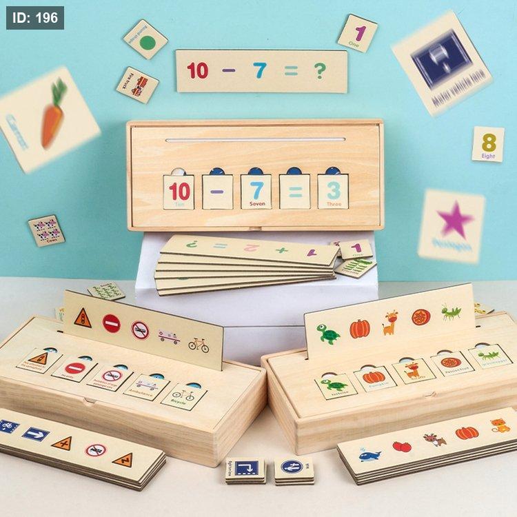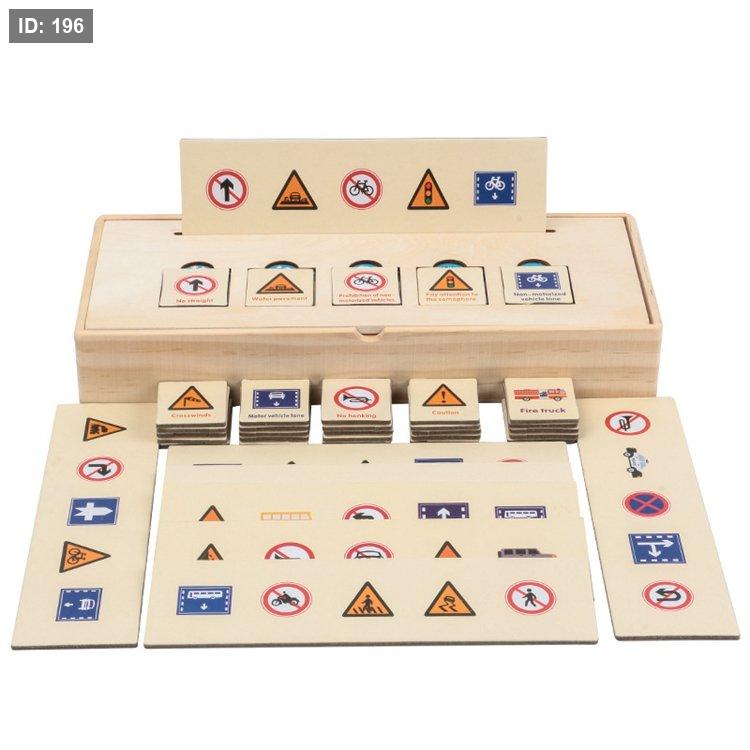 المحتويات: تتضمن مجموعة متنوعة من الألواح الخشبية المزودة بأرقام وعمليات حسابية، بالإضافة إلى قطع تحمل إشارات مرور مختلفة للمطابقة والتعرف عليها.
