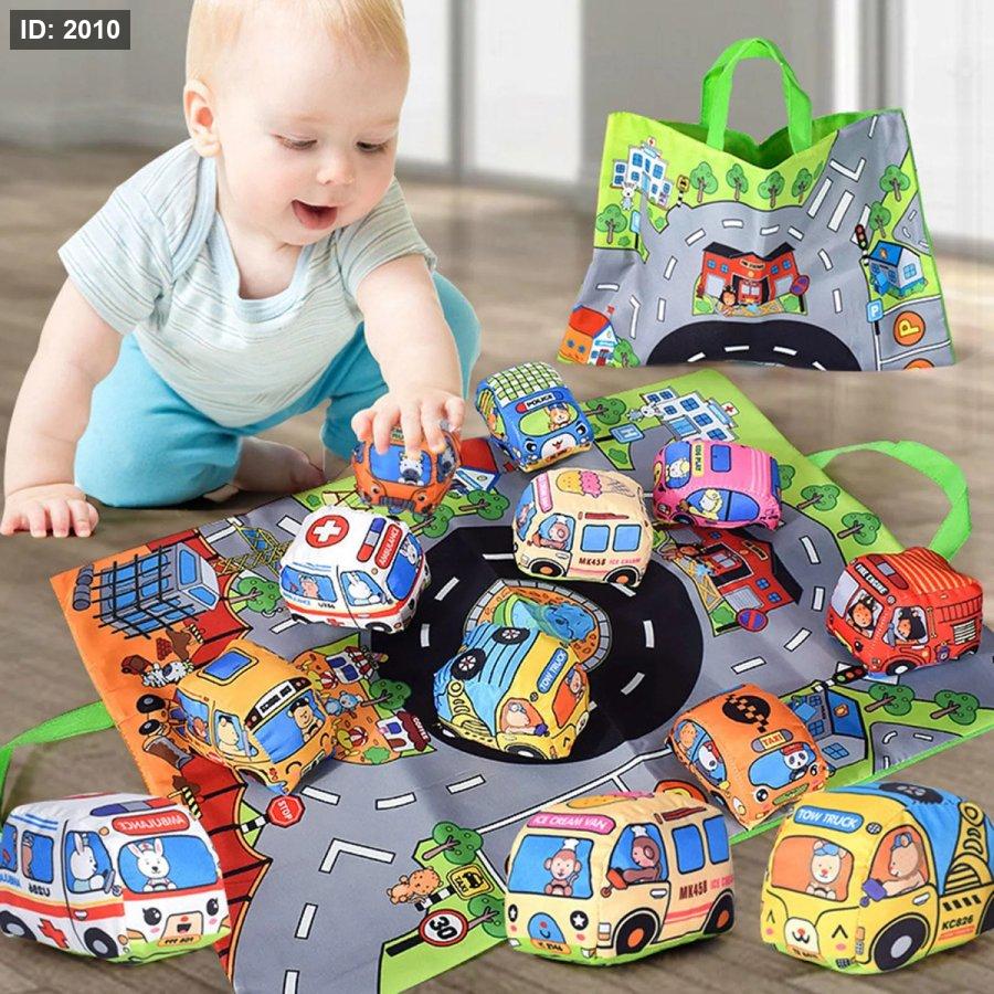 هذا المنتج عبارة عن مجموعة ألعاب أطفال ناعمة من نوع "K's Kids Take Along Set" والتي تتضمن سجادة لعب مبطنة تعمل أيضاً كحقيبة تخزين، بالإضافة إلى عدة سيارات ألعاب قماشية محشوة.