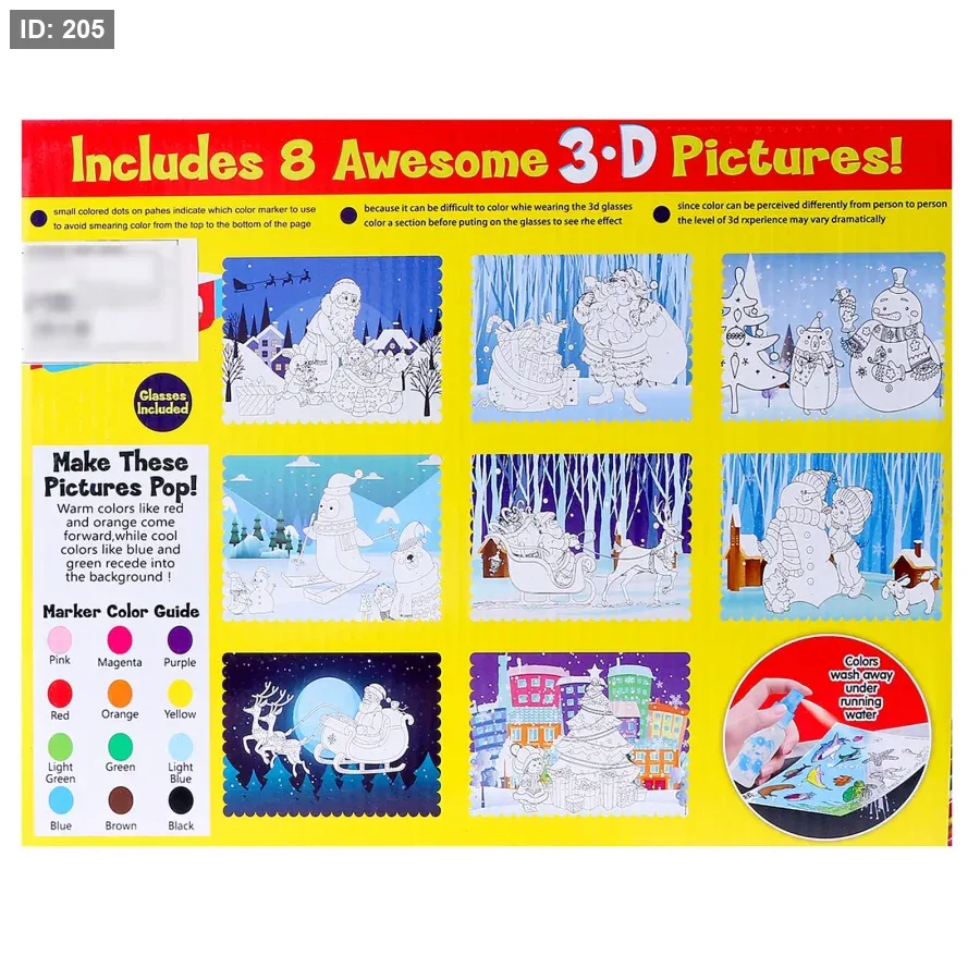 دفتر تلوين ثلاثي الأبعاد هذا يتيح للأطفال إنشاء تأثيرات ثلاثية الأبعاد مذهلة باستخدام أقلام التحديد المرفقة. يكمل الأطفال الصور المرمزة بالألوان، وعند ارتداء النظارات ثلاثية الأبعاد المضمنة، تبدو الصور وكأنها تنبثق وتتحرك.