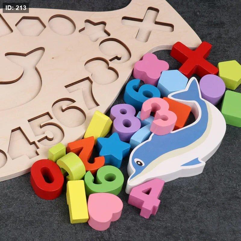المحتويات: تتضمن عادةً قاعدة الدولفين ومجموعة من الكتل الملونة التي تحمل أرقامًا وأشكالًا.