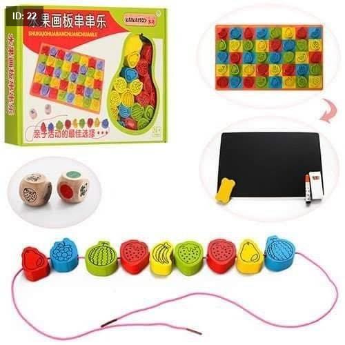 الهدف التعليمي: تساعد هذه الألعاب الأطفال على ممارسة المهارات الحركية الدقيقة (fine motor skills) من خلال إدخال الخيط في الثقوب، وتعزز التنسيق بين العين واليد، وتساعد في تعلم الألوان والأشكال والتعرف على الفواكه المختلفة.