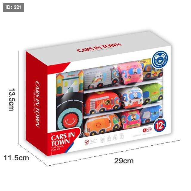 تتضمن 9 سيارات مختلفة مصنوعة من قماش ناعم يناسب الأيدي الصغيرة.