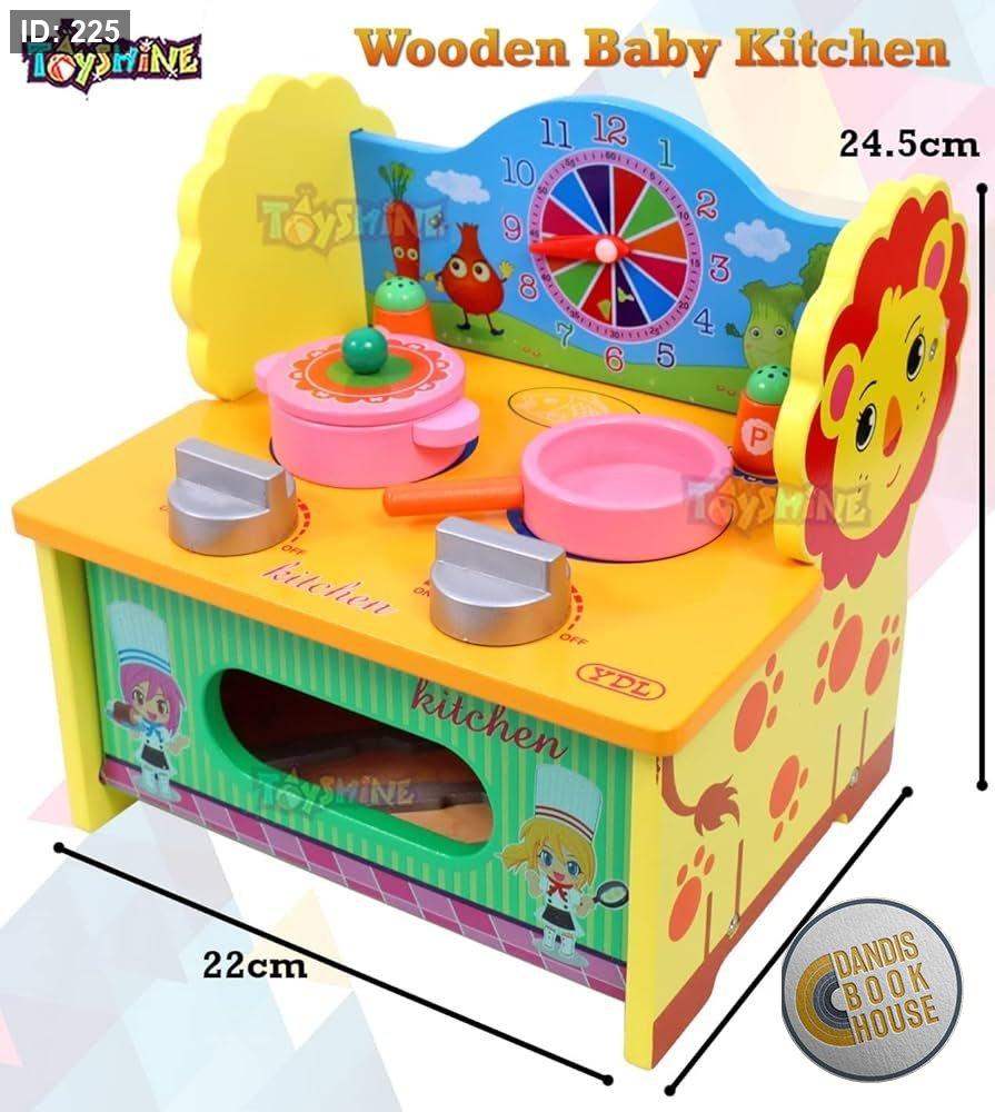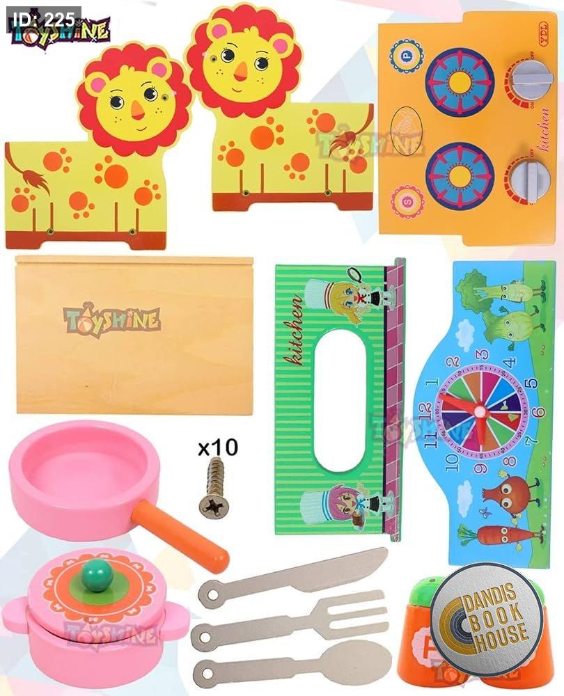 المحتويات: تتضمن المجموعة موقدًا خشبيًا صغيرًا به شعلتان وفرن، بالإضافة إلى إكسسوارات مثل قدر، ومقلاة، وملعقة، وشوكة، وسكين. كما تحتوي على لوحة خلفية مزينة برسومات حيوانات وساعة.