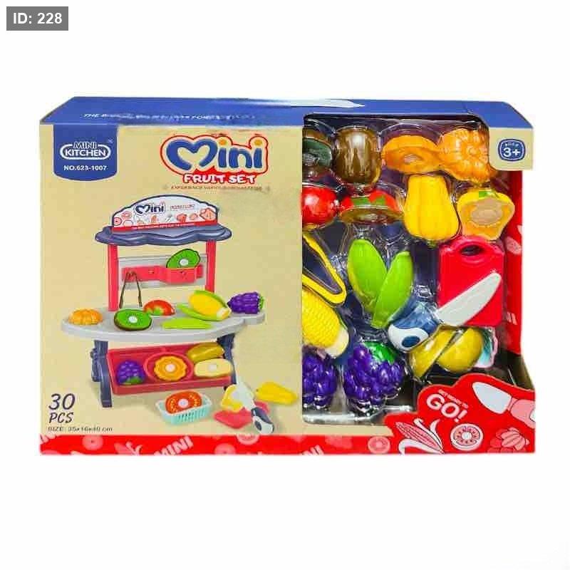 لعبة مجموعة فواكه ميني كيتشن (Mini Fruit Set) هي لعبة تقمص أدوار تعليمية للأطفال تأتي مع 30 قطعة من الفواكه والخضروات البلاستيكية. تم تصميم اللعبة لتعزيز المهارات الاجتماعية والتواصلية واليدوية لدى الأطفال من خلال اللعب التخيلي.