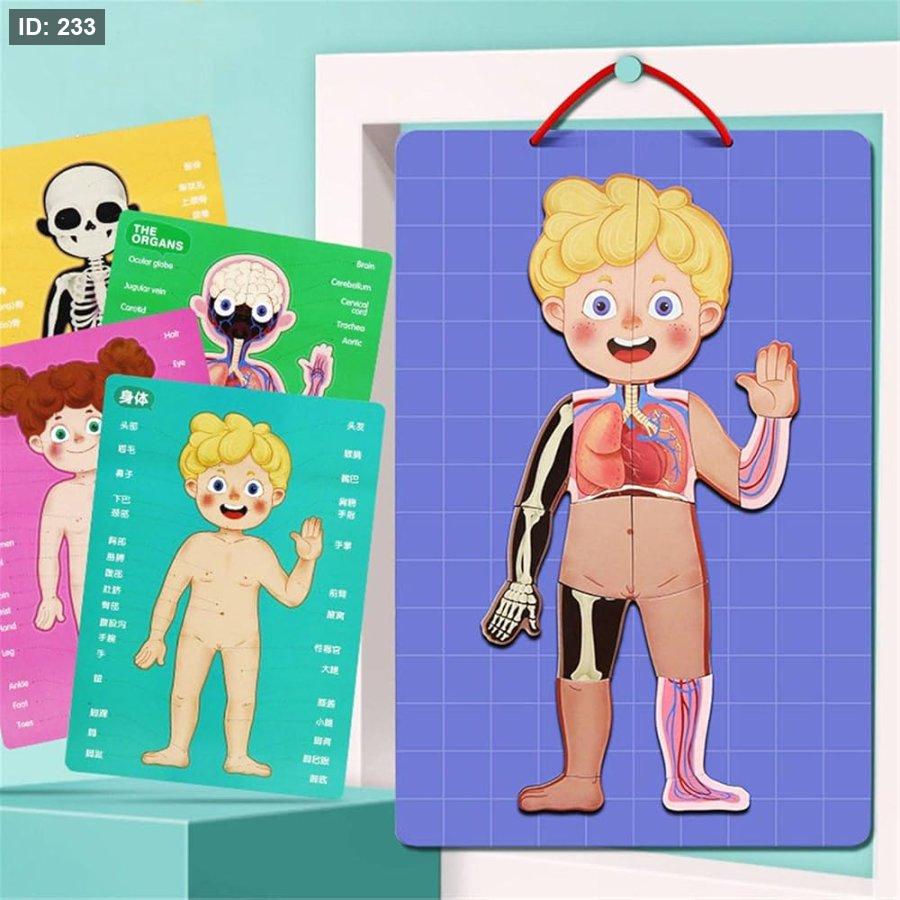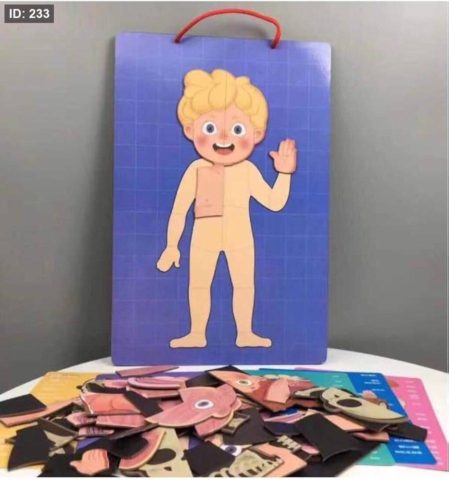 الوصف: عبارة عن أحجية مغناطيسية مصممة لمساعدة الأطفال على تعلم أجزاء جسم الإنسان المختلفة.