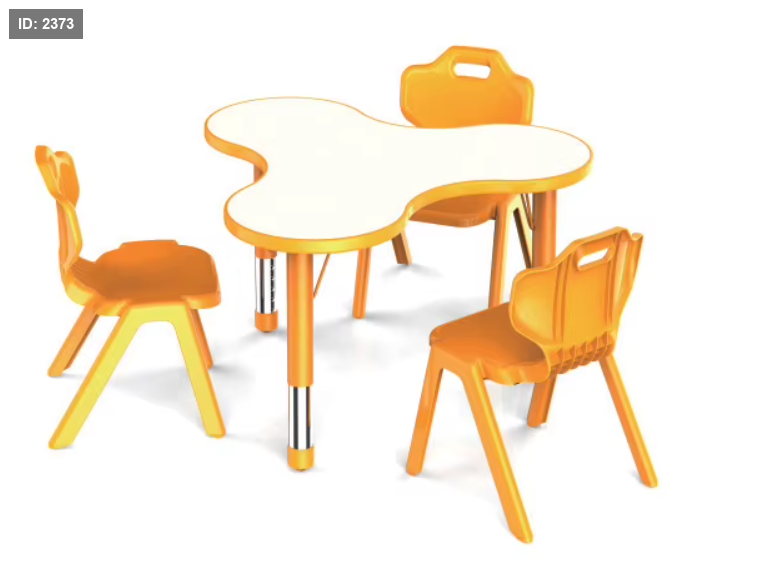 تصميم تفاعلي مميز: طاولة بشكل ورقة برسيم (ثلاث فصوص) تتيح لثلاثة أطفال الجلوس بشكل مريح ومتقابل، مما يعزز التفاعل والعمل الجماعي.
