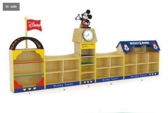 خزانة أرفف خشبية للأطفال بتصميم "ميكي ماوس" (Mickey Mouse) على شكل قلعة، وهي مخصصة لتجهيز رياض الأطفال أو غرف الألعاب.