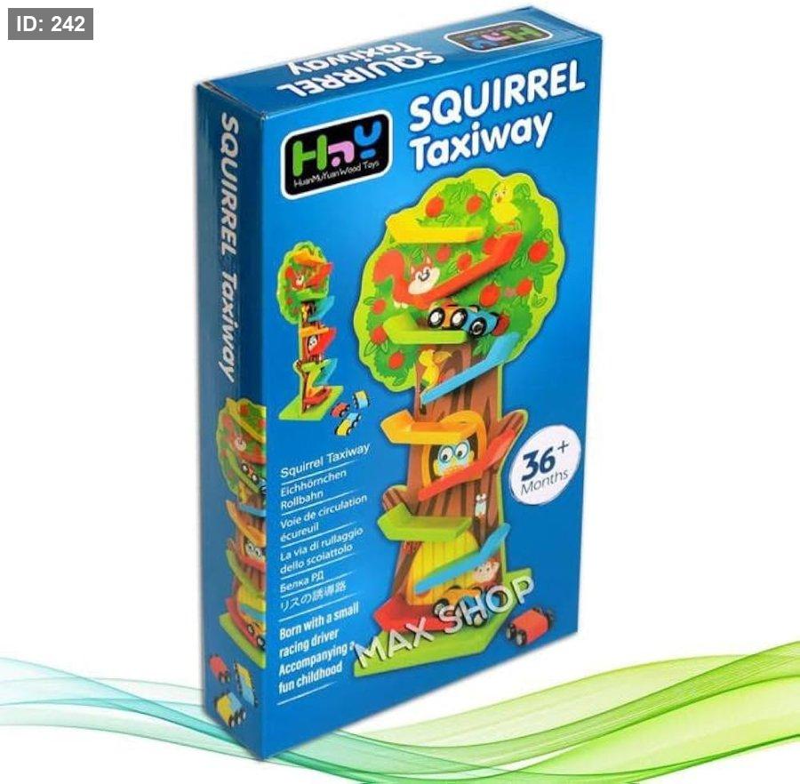 هذا المنتج هو لعبة منحدر سيارات خشبية تحمل اسم "ممر السنجاب" (Squirrel Taxiway).