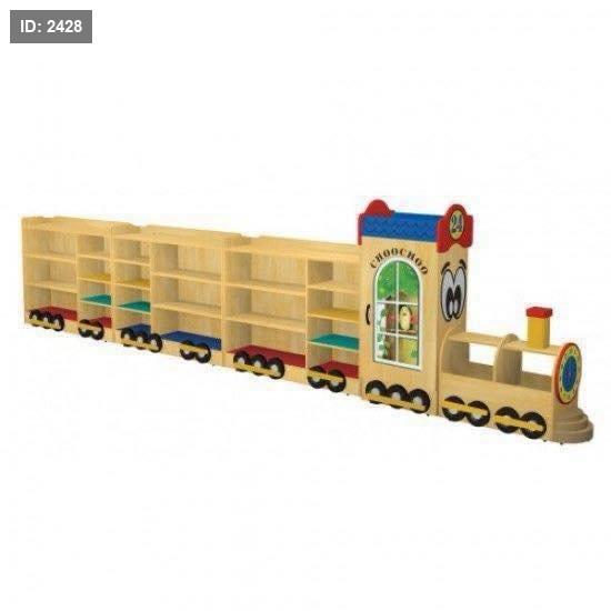 خزانة ألعاب وكتب خشبية للأطفال مصممة على شكل قطار، وتُستخدم بشكل شائع في رياض الأطفال والحضانات أو غرف ألعاب الأطفال المنزلية.