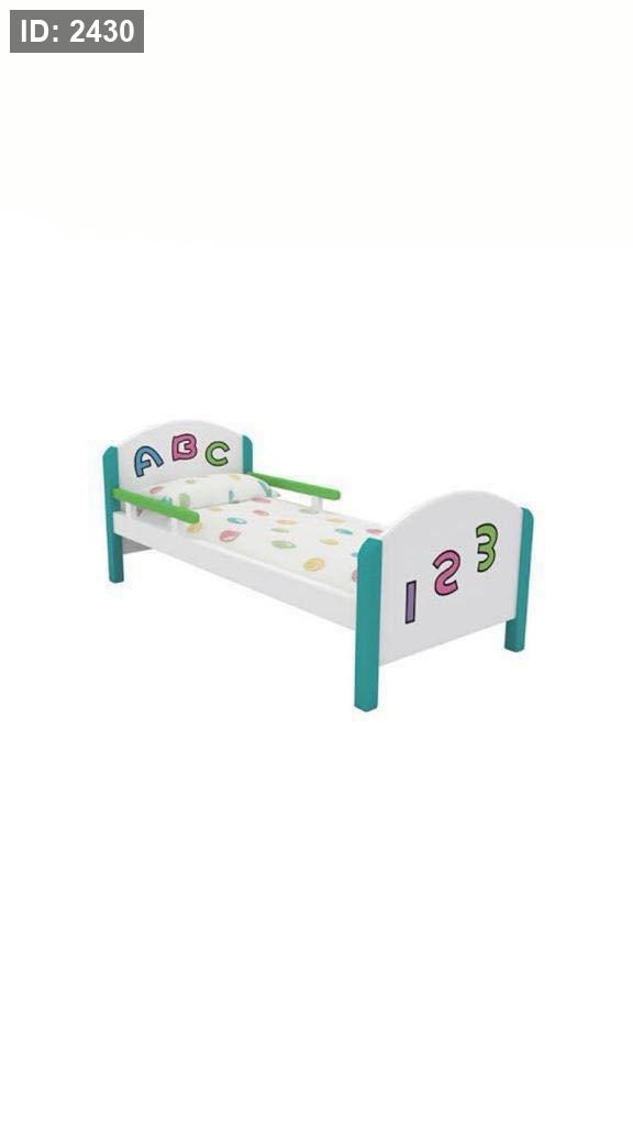 سرير أطفال خشبياً فردياً مُصمماً برسومات تعليمية ملونة، يتميز بوجود حروف "ABC" على اللوح الرأسي عند الرأس وأرقام "123" عند القدمين. هذا السرير مُصمم خصيصاً للاستخدام في غرف الأطفال، الحضانات، ورياض الأطفال.