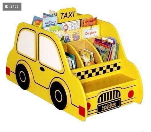 مكتبة خشبية للأطفال مصممة على شكل سيارة أجرة (Taxi) صفراء زاهية، وهي مصممة لتكون قطعة أثاث تعليمية وممتعة في آن واحد.