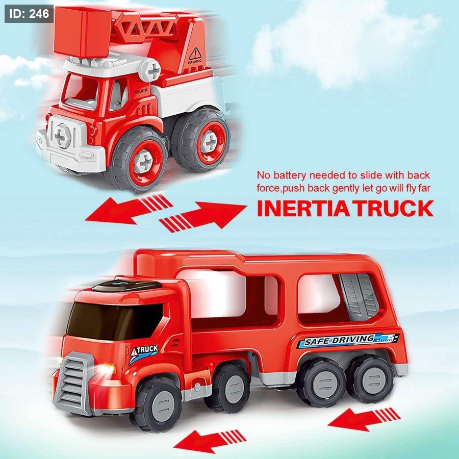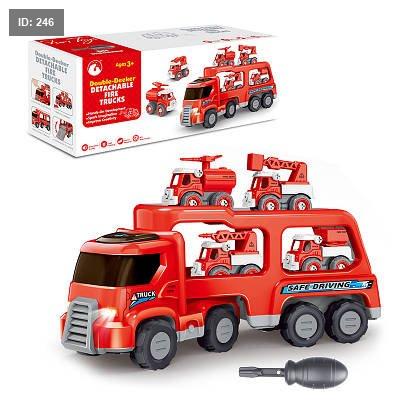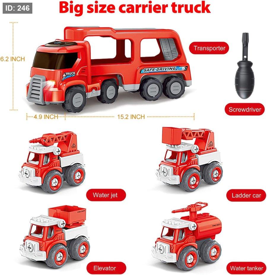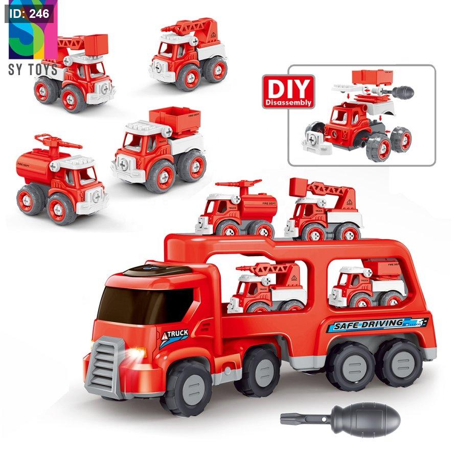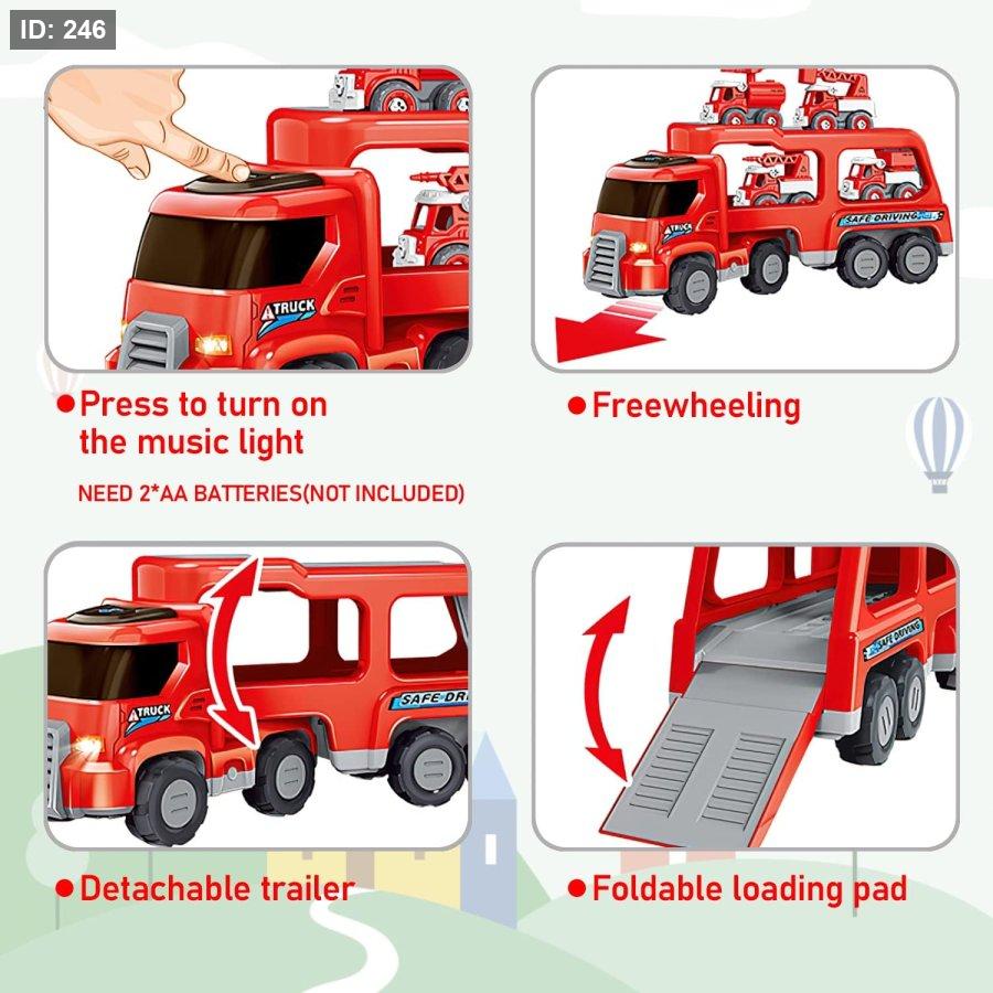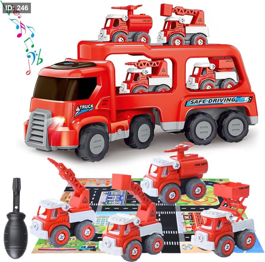 النوع: مجموعة ألعاب شاحنة نقل كبيرة تحمل سيارات إطفاء صغيرة يمكن فصلها وتركيبها.