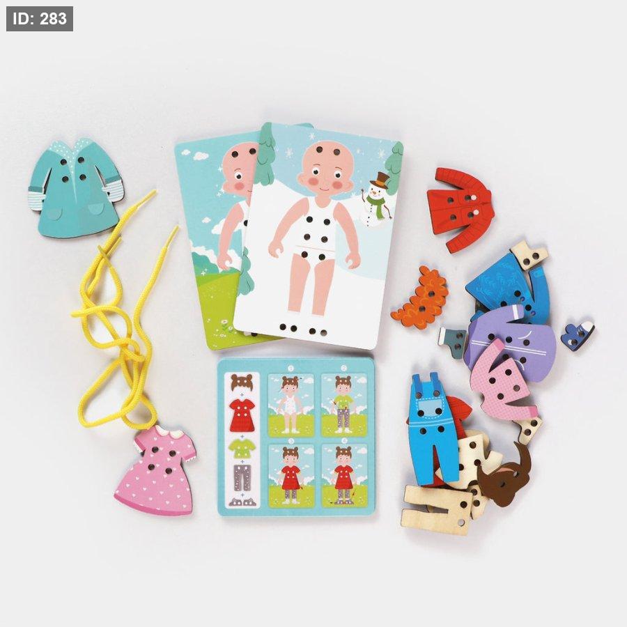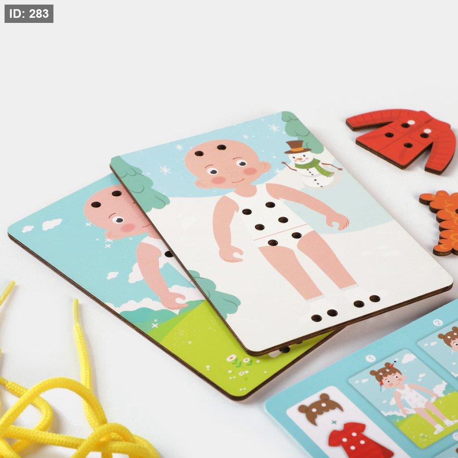 يُظهر غلاف الصندوق رسوماً توضيحية لدمية ولد وفتاة يمكن للأطفال ارتداء ملابس لهما باستخدام خيوط خاصة. [1.1] يُقترح استخدام اللعبة في أماكن مثل المطاعم أو في السيارة. [1.1]