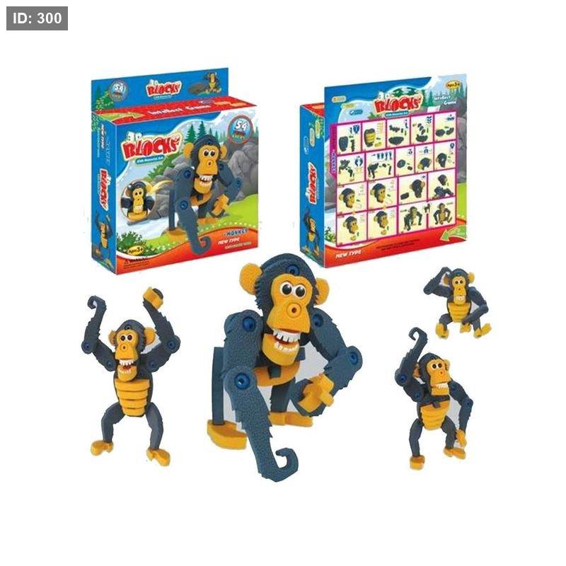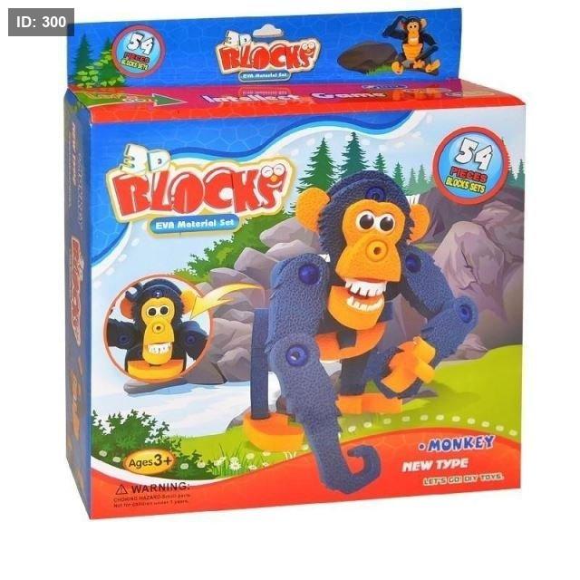 لعبة المكعبات هذه عبارة عن مجموعة بناء ثلاثية الأبعاد من فوم EVA، تُعرف باسم "مونكي بلوكس" (Monkey Blocks) أو "باندا بلوكس" (Panda Blocks). تتكون المجموعة من 54 قطعة يمكن تجميعها لتشكيل نموذج لحيوان قرد متحرك، كما هو موضح على الصندوق.