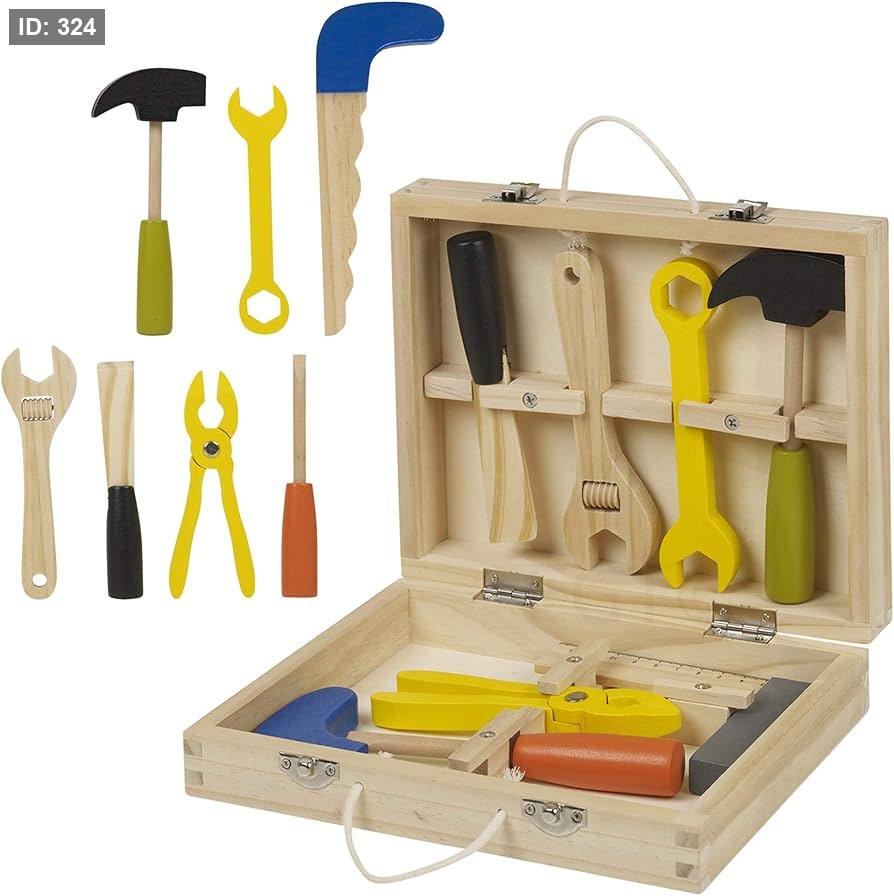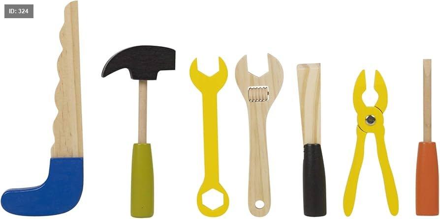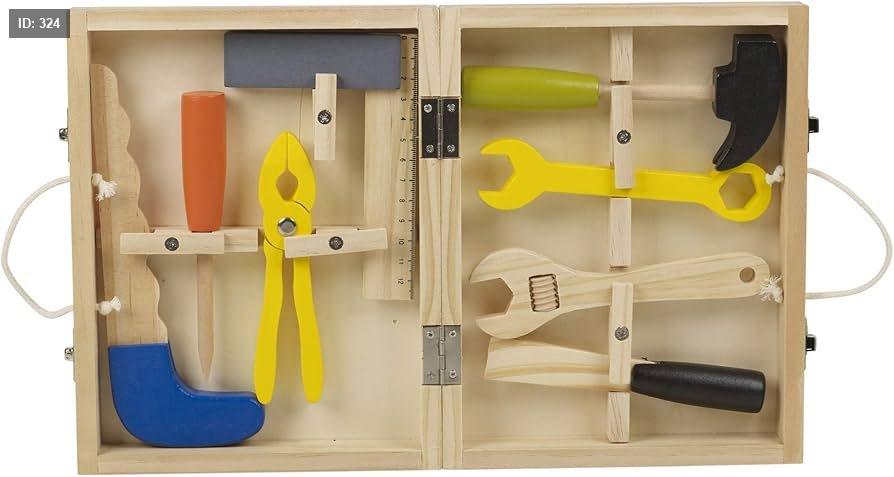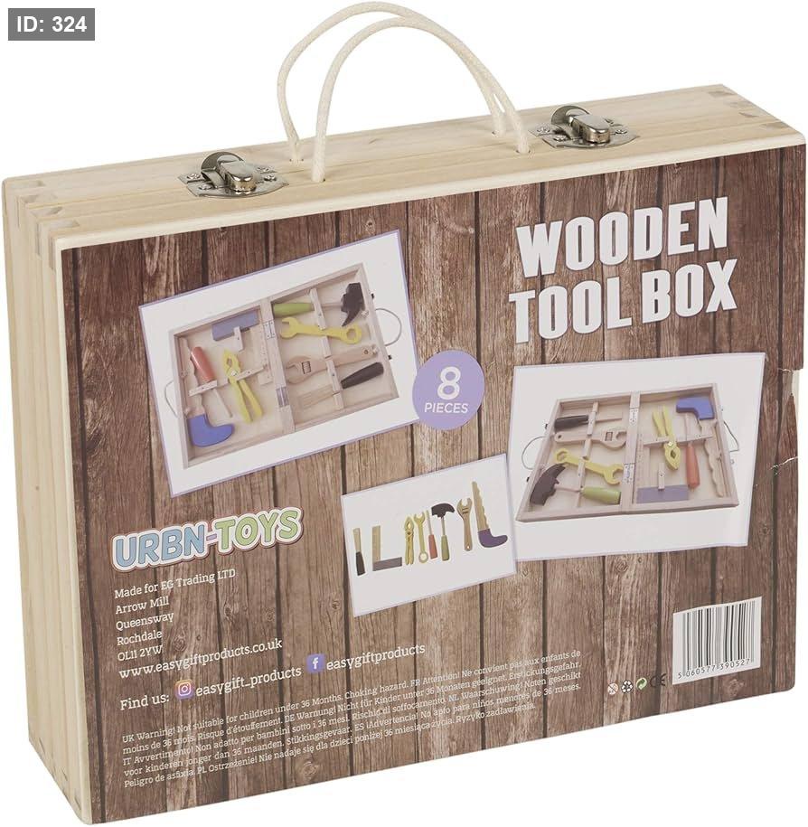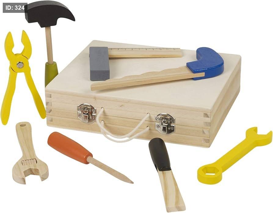 صندوق الأدوات الخشبي المصغر من URBN-TOYS هو مجموعة ألعاب مكونة من 8 قطع. يتضمن الصندوق الأدوات التالية: