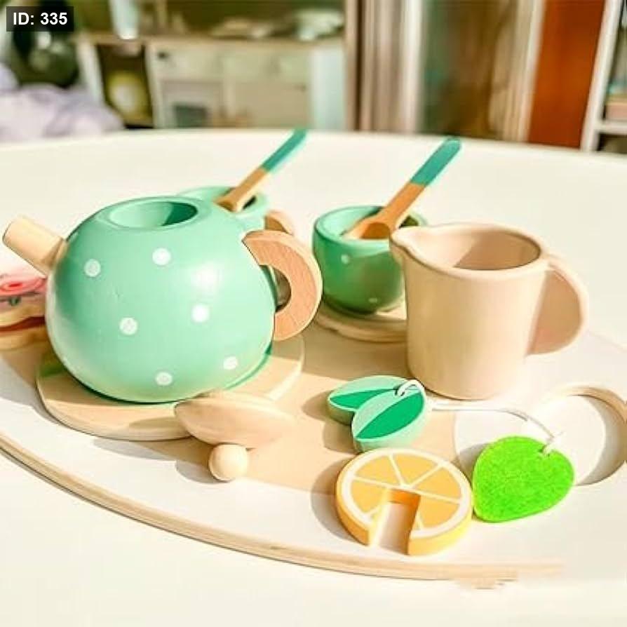 التصميم: تتميز القطع بتصميم خشبي بألوان زرقاء مخضرة وبيضاء وصفراء، مع تفاصيل جذابة مثل النقاط على إبريق الشاي ورسمة زهرة على إحدى قطع الطعام.