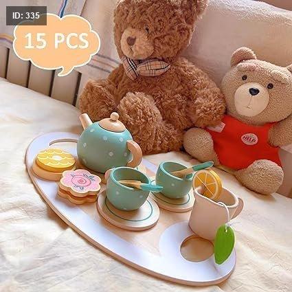 المحتويات: المجموعة مكونة من 15 قطعة وتشمل صينية خشبية، إبريق شاي، كوبين، صحنين، ملعقتين، وشريحة ليمون، وحلوى على شكل دونات.