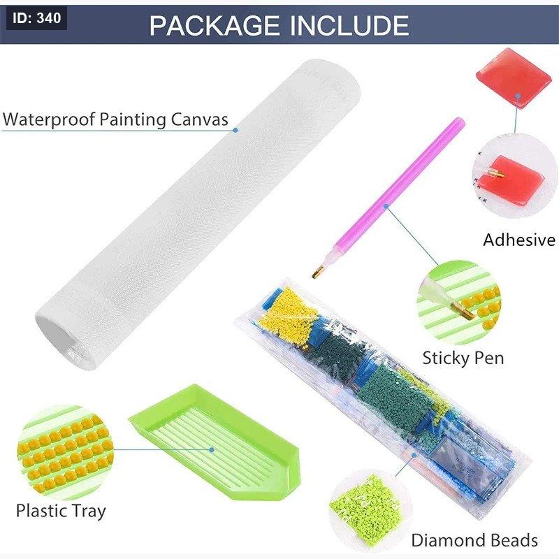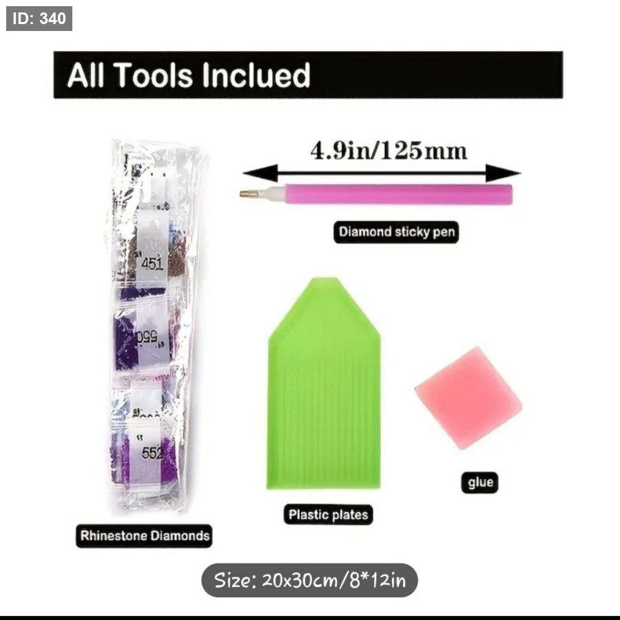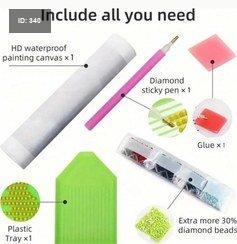 المحتويات: عادة ما تحتوي المجموعة على قماش لاصق بقياس محدد (في هذه الحالة 50x40 سم)، خرز كريستالي (أحجار الراين)، وأدوات تطبيق مثل القلم، الصينية، والمادة اللاصقة.