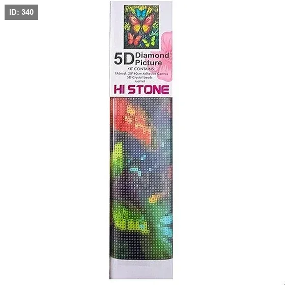 طقم رسم بالماس من نوع 5D للرسم الفني يُعرف باسم HI STONE. يتضمن هذا النوع من المجموعات قماشاً لاصقاً مطبوعاً مسبقاً، وخرزاً كريستالياً صغيراً متعدد الأوجه، وأدوات لتسهيل عملية وضع الخرز على القماش لإنشاء صورة لامعة ثلاثية الأبعاد.