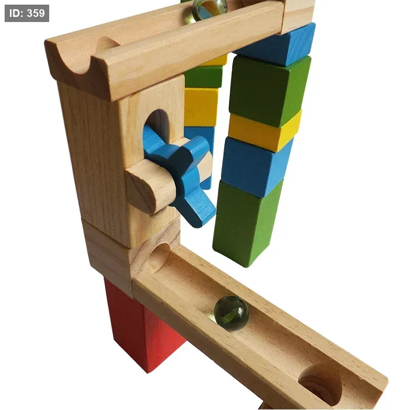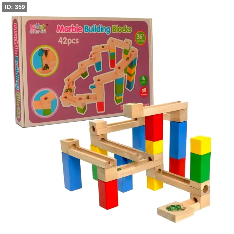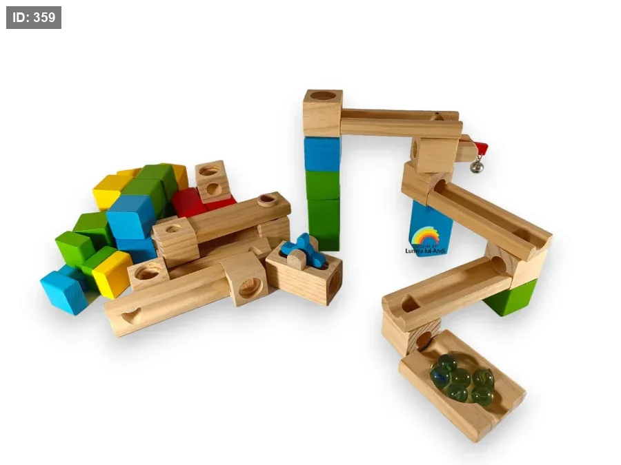 المحتوى: تُظهر الصورة نموذجًا مجمعًا لمسار رخامي مصنوع من القطع الخشبية، بالإضافة إلى كرات رخامية.