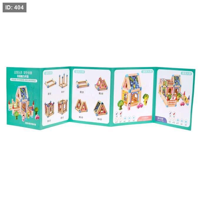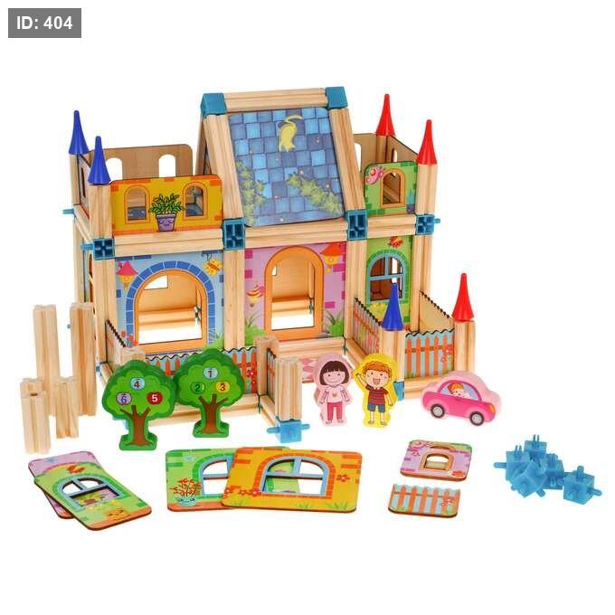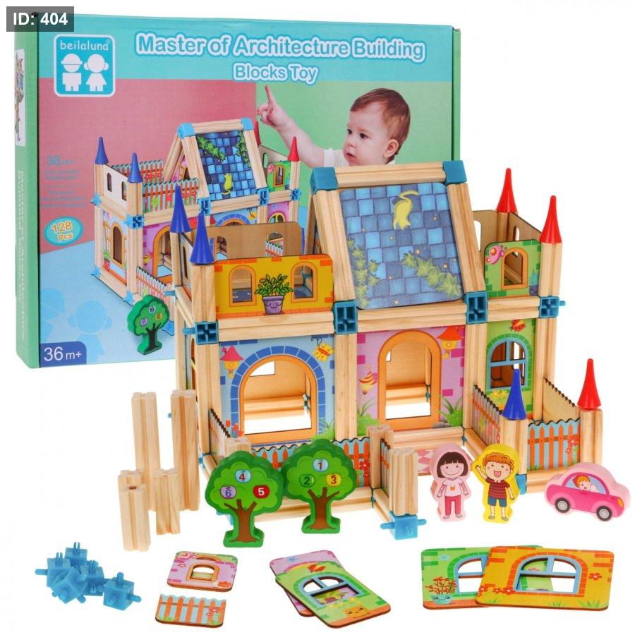 المحتويات: تتكون المجموعة من 128 قطعة خشبية ملونة بأشكال مختلفة، بما في ذلك ألواح جدران، أسقف، أشجار، شخصيات أطفال، وسيارات.