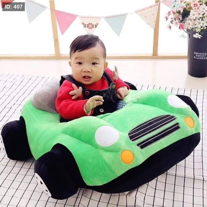 كرسي الأريكة الناعم في الصورة مصمم على شكل سيارة زرقاء وهو مخصص للأطفال الرضع لمساعدتهم في تعلم الجلوس بشكل آمن ومريح.