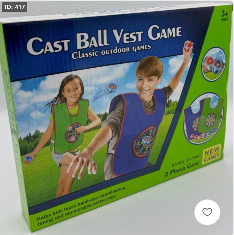 لعبة Cast Ball Vest Game هي لعبة كلاسيكية للعب في الهواء الطلق تتضمن سترة لاصقة وكرات ناعمة يمكن رميها ولصقها على السترة. اللعبة مصممة للاعبين وتساعد الأطفال على تعلم التنسيق بين اليد والعين، التوقيت، وتشجع على اللعب النشط.