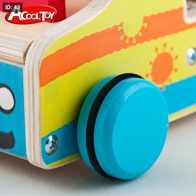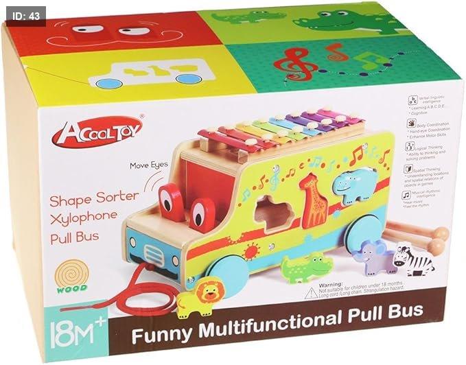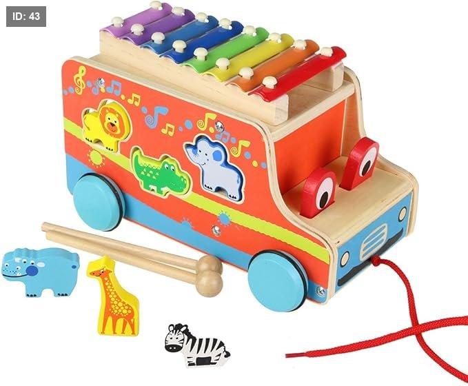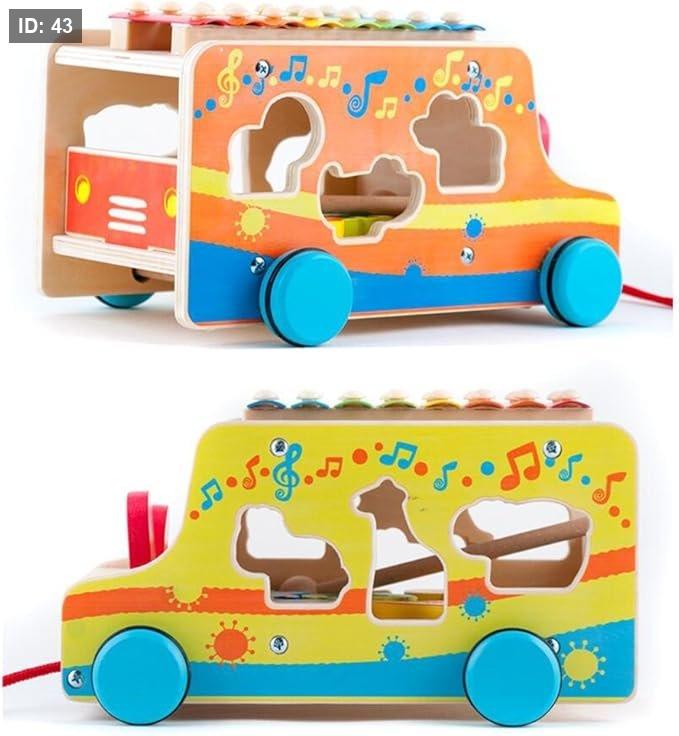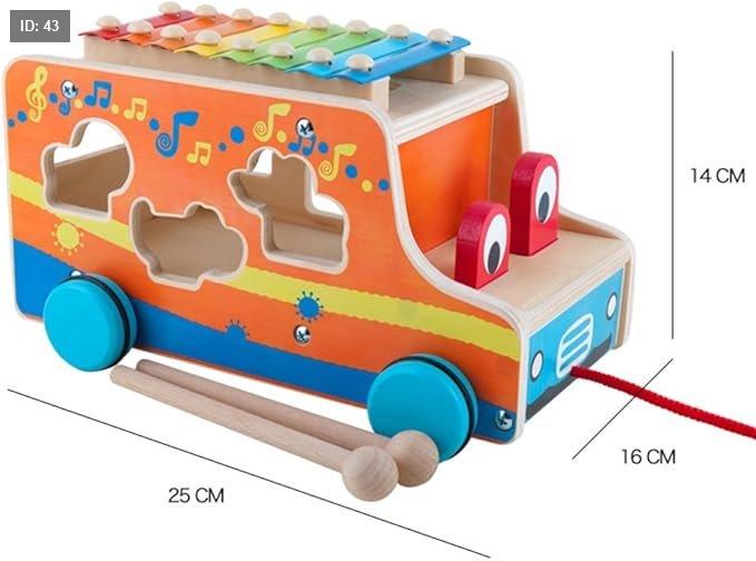 مصنوع من خشب صلب عالي الجودة ومطلي بطبقة آمنة، ويأتي بتصميمات ملونة متنوعة (8 ألوان)، ويمكن النقر على الزيلوفون الموجود على الحافلة للعب به.