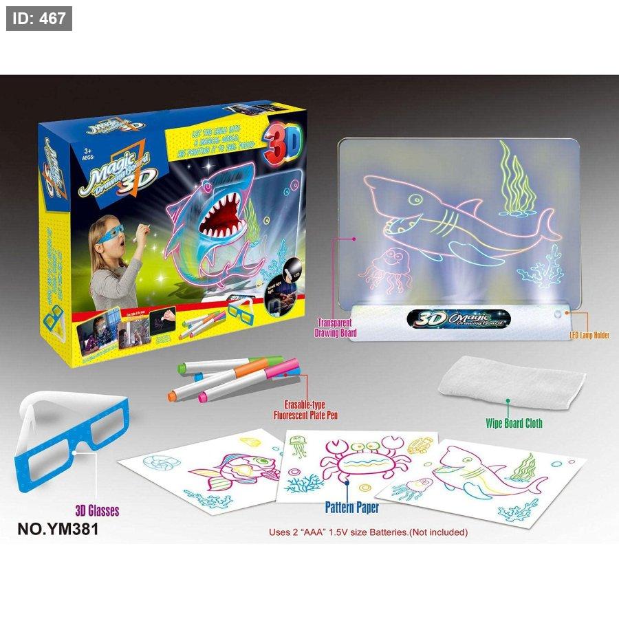 لوح الرسم السحري ثلاثي الأبعاد الظاهر في الصورة هو لعبة إبداعية تتيح للأطفال إنشاء رسومات متلألئة تبدو ثلاثية الأبعاد عند ارتداء النظارات المرفقة.