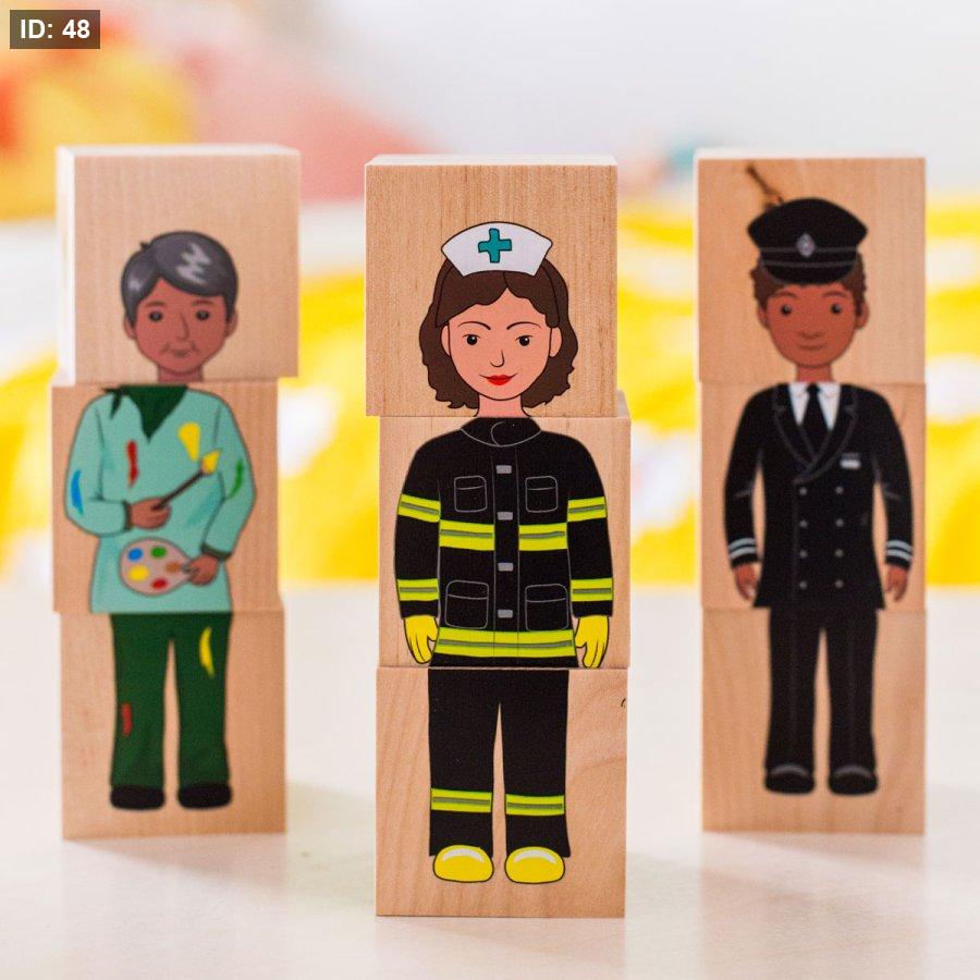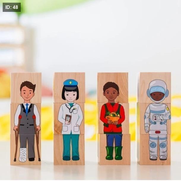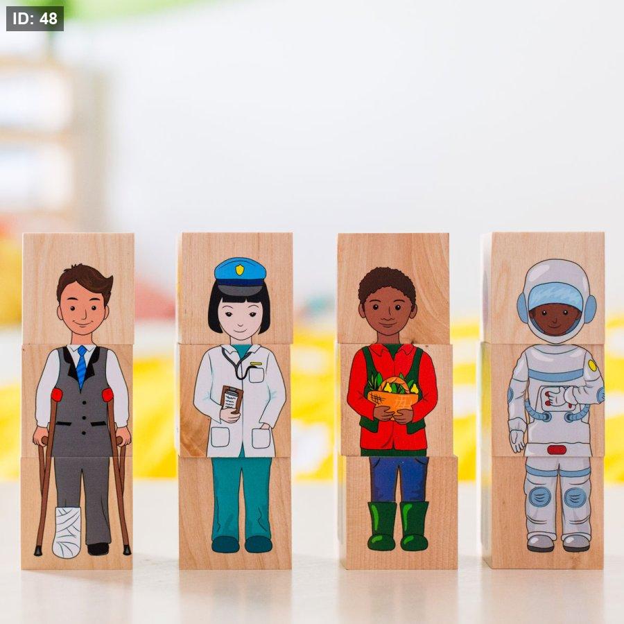 امزج وطابق مجموعة من الرجال والنساء من خلفيات عرقية متنوعة، لإكمال تصميم يضم 16 مهنة مختلفة موجودة في مجتمعنا. بدءًا من قاضية، ورائدة فضاء أمريكية من أصل أفريقي، وصولًا إلى عامل بناء غربي، توفر هذه المكعبات ساعات من المرح وتفتح آفاقًا للحوار حول مكونات مجتمعنا. إنها لعبة رائعة لتنمية المهارات الحركية الدقيقة من خلال تكديس المكعبات في صفوف لإكمال العمل الفني.